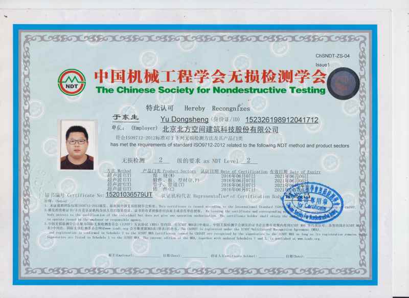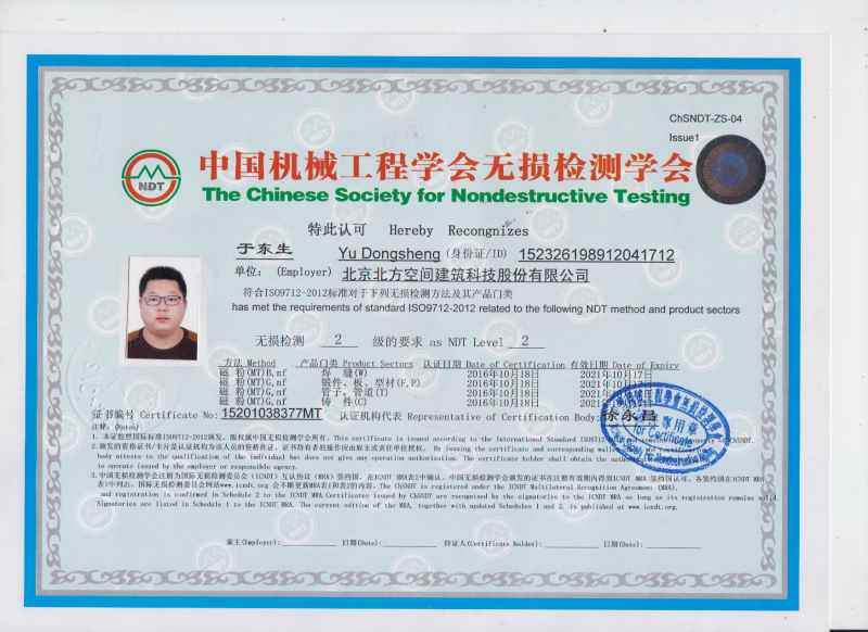 | 2020-2022 內蒙古恒久鋼構(集團)有限公司 項目經理 工作描述: 任陜西艾科萊特項目項目經理,對現場質量、安全、進度、協(xié)調等進行控制管理。 2018-2020 北京華誠博遠鋼結構有限公司 丨 質檢員 工作描述:負責公司承接的呼市金海路改造項目的加工生產、施工質量管理;協(xié)調生產進度! 2014-2018.3 北京北方空間建筑科技股份有限公司 質檢員、無損檢測員 2011-07/2014-08 內蒙古興泰鋼結構有限公司 質檢員、無損檢測員 鄂爾多斯市體育中心體育場 2012.6--2012.10負責鋼結構構件各生產工序的質量檢測(包括UT自檢),對不合格產品及時分析處理,嚴禁不合格品進入下道工序;對即將出場的構件進行合格證簽發(fā),嚴禁不合格品出場。2012.11--2013.3負責工程現場UT無損檢測工作,配合監(jiān)理單位、第三方檢測單位對現場焊縫的焊接質量進行監(jiān)督檢測。 . 鄂爾多斯市國泰商務廣場(CBD) 項目描述:負責鋼結構構件各生產工序的質量檢測,對不合格產品及時分析處理,嚴禁不合格品進入下道工序;對即將出場的構件進行合格證簽發(fā),嚴禁不合格品出場。 . |